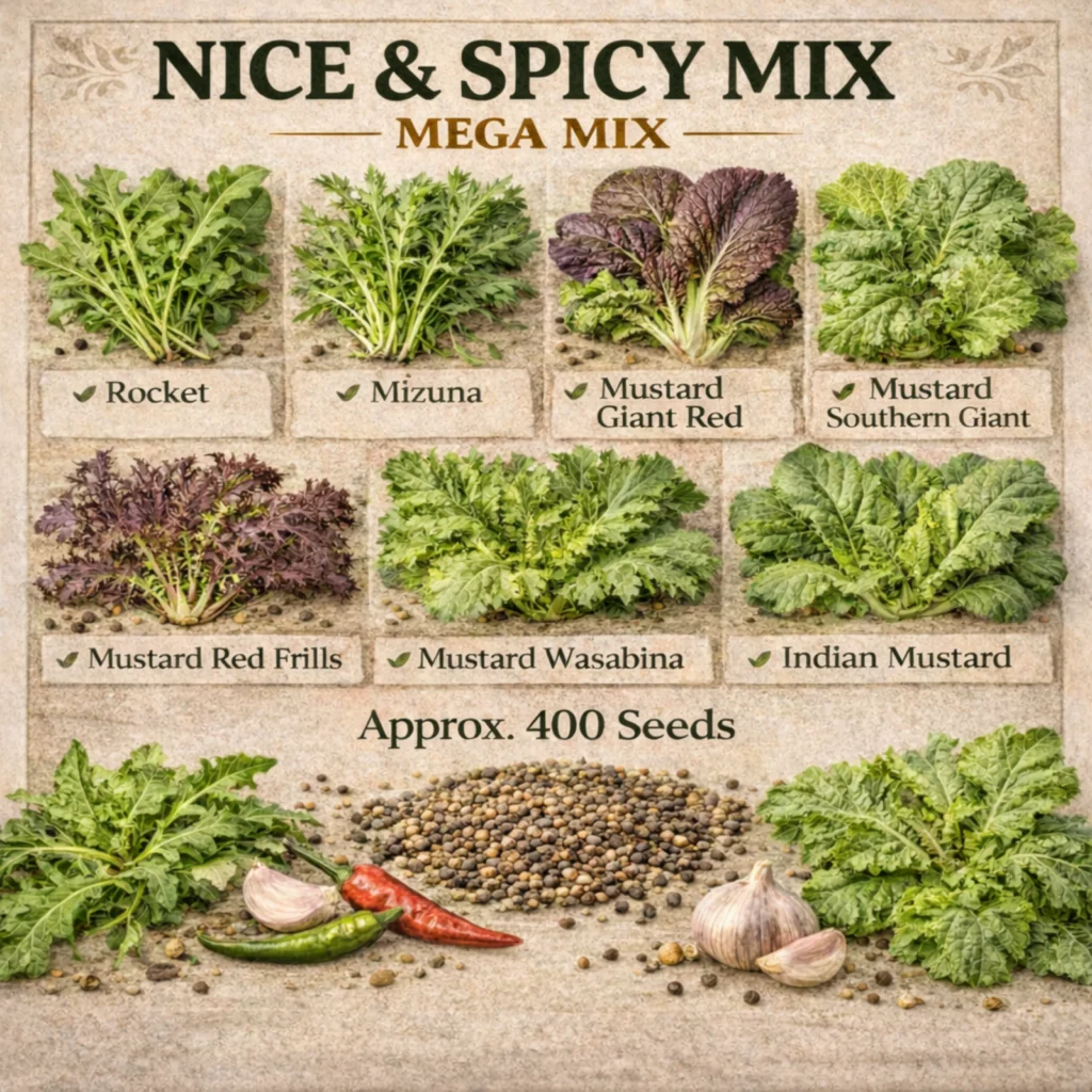 Rocket,Mizuna,Mustard Giant Red,Mustard Southern Giant,Mustard Red Frills,Mustard Wasabina,Indian Mustard
