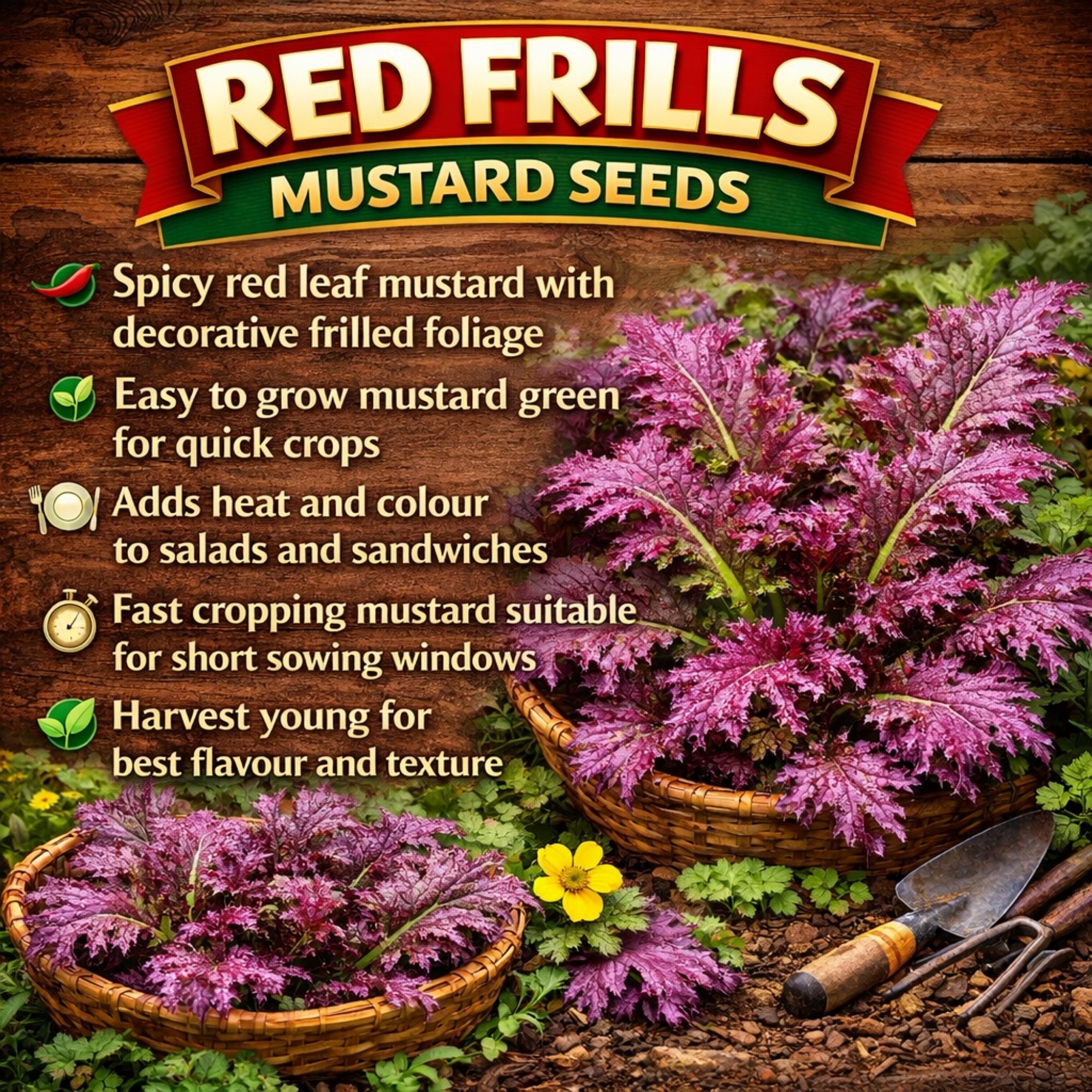 Red Frills Mustard is an attractive variety producing finely frilled purple leaves with a mild mustard flavour. Excellent for salads and garnishes, it adds colour and texture to dishes.